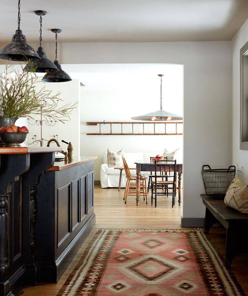 Việc sử dụng một tấm thảm mang phong cách vintage với hoạt tiết đặc sắc trong không gian bếp sẽ che được phần nền nhà trống trải. Trái ngược với vẻ cứng cáp và bóng loáng của các thiết bị gia dụng, việc sử dụng một tấm thảm trong lúc nấu ăn sẽ khiến gia chủ có cảm giá thật thoải mái, nhẹ nhàng và ấm áp; đồng thời, màu sắc và hoạ tiết trên tấm thảm cũng khiến phòng bếp bớt đơn điệu hơn.